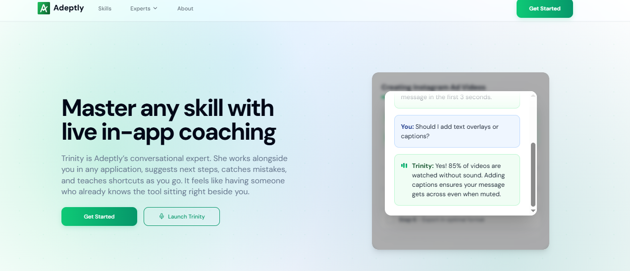 Adeptly is an AI-powered coaching tool that provides real-time workflow assistance through a conversational expert named Trinity.