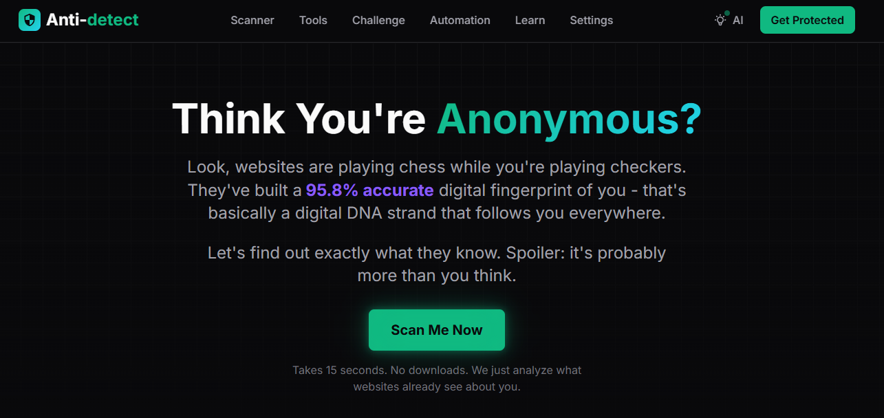 Anti-Detect.com is an advanced free online platform designed to help users understand and protect their digital identity by analyzing browser fingerprints and evaluating privacy risks. It caters to privacy-conscious individuals, cybersecurity professionals, and automation specialists who need to assess how unique and trackable their browser and device are—even in the absence of cookies. The platform provides a quick, thorough fingerprint scan that covers all major detection vectors, including network, navigator, graphics, audio, fonts, locale, and automation detection. In just 15 seconds and without any downloads, users receive a detailed report comparing their browser’s fingerprint to a vast database of over 127,000 profiles.