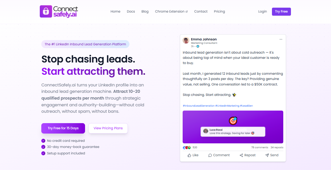 ConnectSafely.ai is an AI-powered lead generation platform that automates engagement on LinkedIn, enabling B2B professionals to attract qualified leads effortlessly.