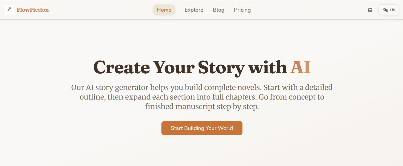 Flow Fiction is an AI-powered story generator that helps users create novels by providing prompts, plot suggestions, and character ideas tailored to their writing style.