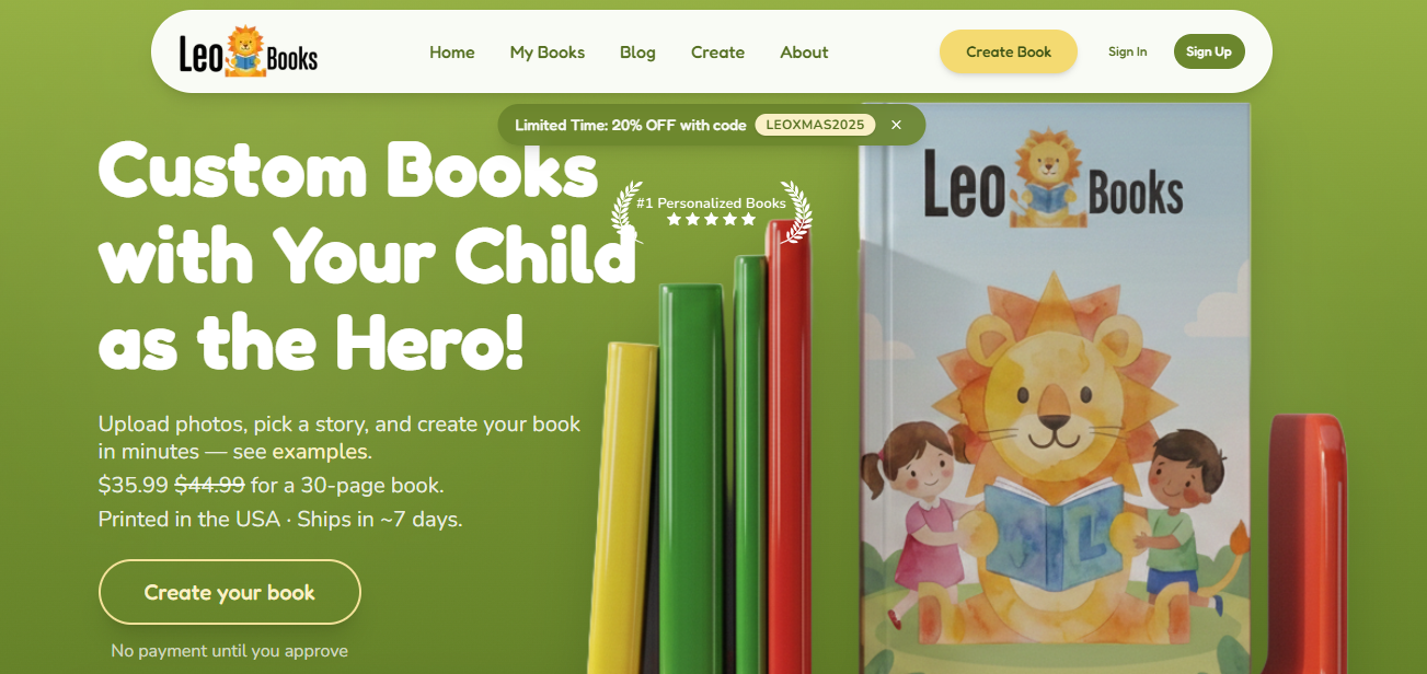 Leo Books is an online service that enables users to create personalized children's books using their photos and story ideas.