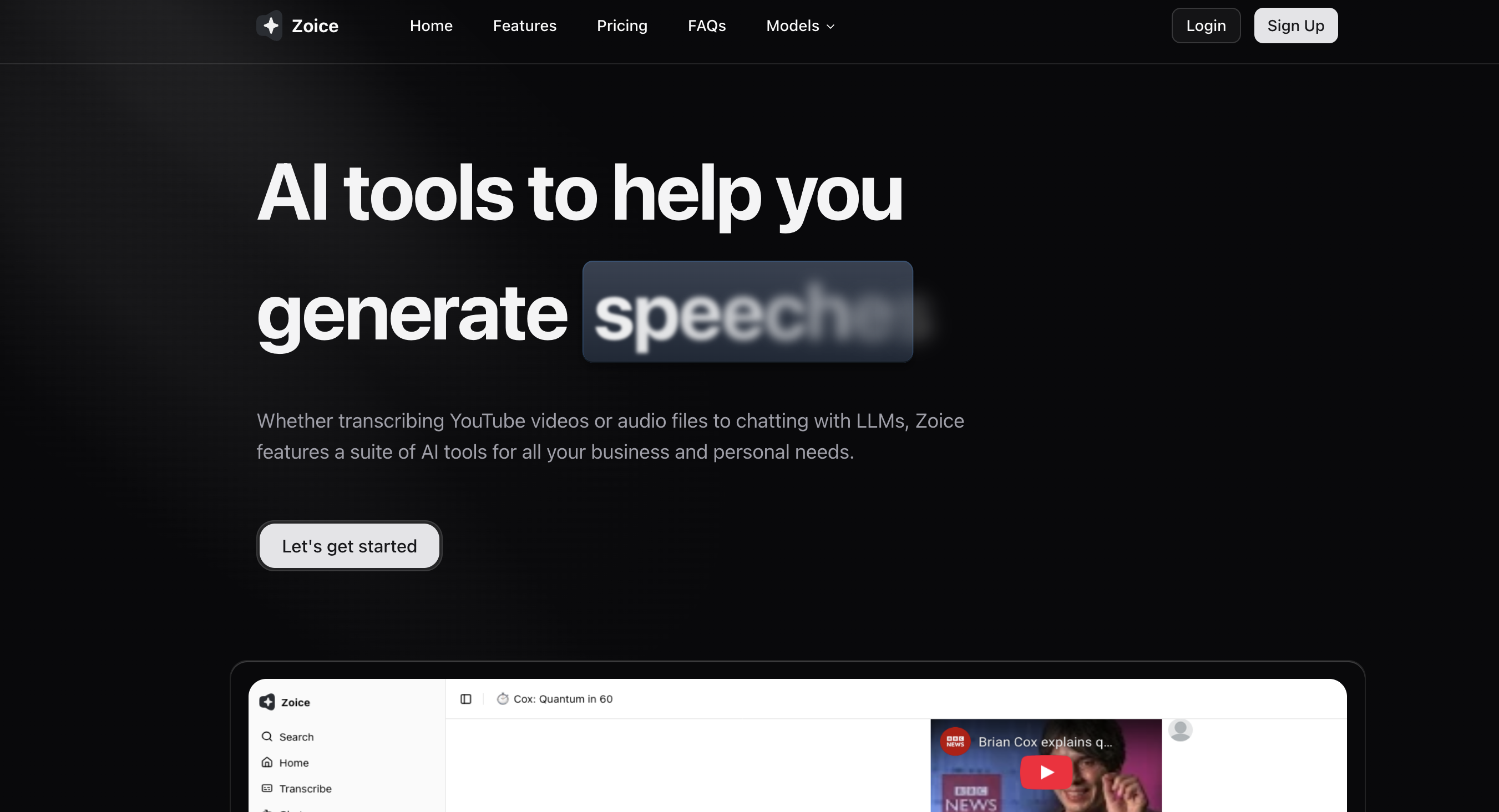 Zoice is an AI-powered tool that transcribes audio, generates written content, and animates visuals to enhance content creation.